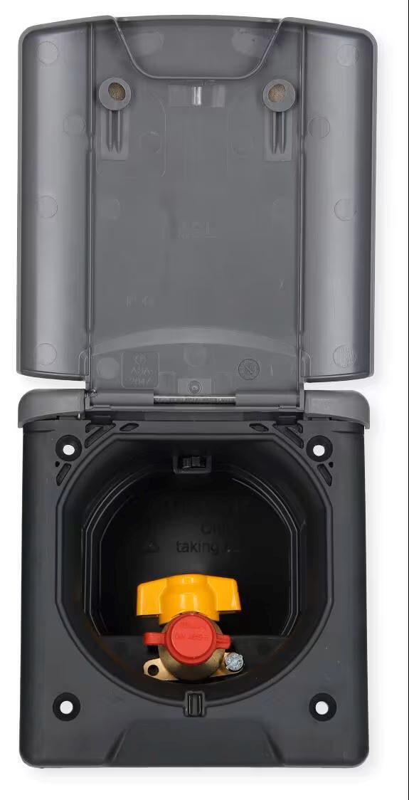Gassteckdose mit Magnetverschluss für den Anschluss eines externen Gasgerätes wie zum Beispiel einem Gasgrill. Die Dose verfügt über einen Klappdeckel und ist UV-beständig. Neue optimierte Form mit sicherem Magnetverschluss-Klappdeckel und geringer Aufbauhöhe (16mm).