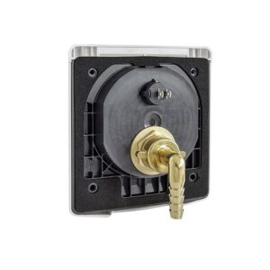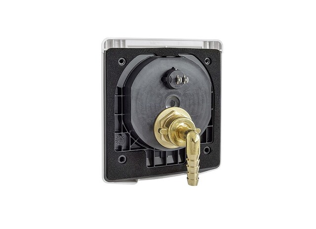 Wassersteckdose mit Gardena-Anschluss, rückseitig abgew. Schlauchanschluss (10 mm), Wippschalter und Magnetverschluss. Für drucklose Systeme.