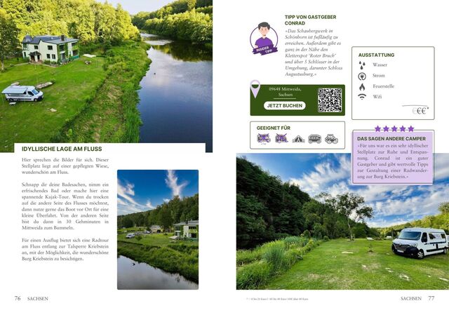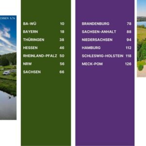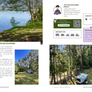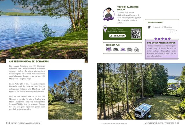 Der erste Eindruck: Ja, der zählt! Deswegen ist dieser Reiseführer mit vielen Stellplatzbildern, ausführlichen Beschreibungen, Ortsangaben, Ausstattungsmerkmalen und Bewertungen anderer Campinggäste versehen. Jeder Platz ist für Wohnmobile geeignet. An Fahrzeugsymbolen, kannst du ablesen, ob der Platz ebenfalls für Wohnwagen, Dachzelte oder Zelte geeignet ist. So kannst du unbesorgt dein neues Ziel ansteuern.