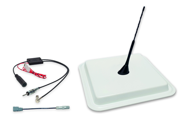 Aktive Kombilflex Dachantenne, inkl. Montageplatte mit integrierter Groundplane zur Installation auf nicht-metallischen Dachflächen (GFK) von Reisemobilen, 43 cm Antennenstab für FM/DAB+ Empfang über ein Kabel, Adapter FAKRA auf M10 x 0,75 und passive Weiche GAB-4724.02 zur Aufsplittung am Radio im Lieferumfang, 12 V-Stromversorgung erfolgt über die DIN-Steckhülse der Weiche (Phantomspeisung).