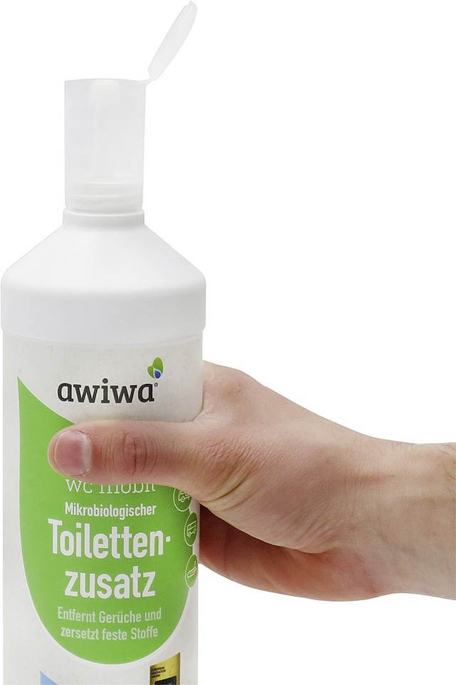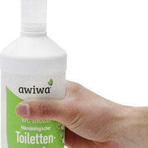 Bei tragbaren Toiletten (bis 20L) sollte 50 ml awiwa wc mobil in den Fäkalientank gegeben werden. Für eine komfortable und schnelle Dosierung, befüllen Sie den Dosierkopf 2x bis zum Rand (25 ml). Die gleiche Dosierung wird auch für den Spülwasserzusatz benutzt.