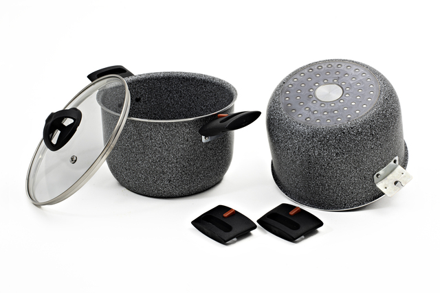 Topf aus Antihaft Aluminium mit abnehmbaren Griffen und Glasdeckel, geeignet für Induktion.