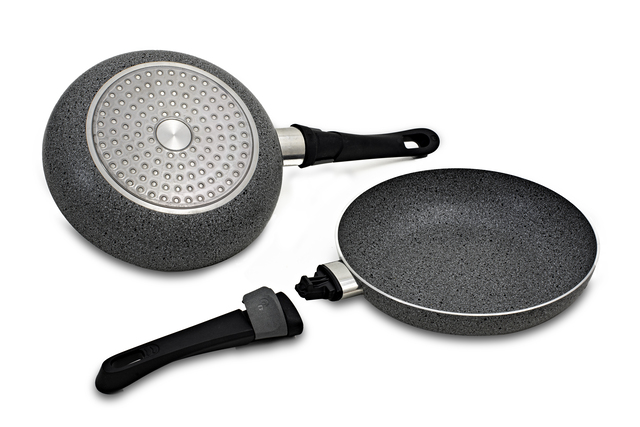 Pfanne aus Antihaft Aluminium mit neuem Lock-Up Griff, geigneet für Induktion.