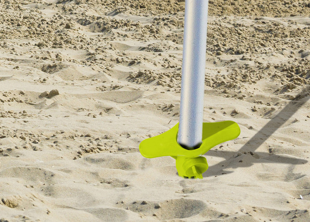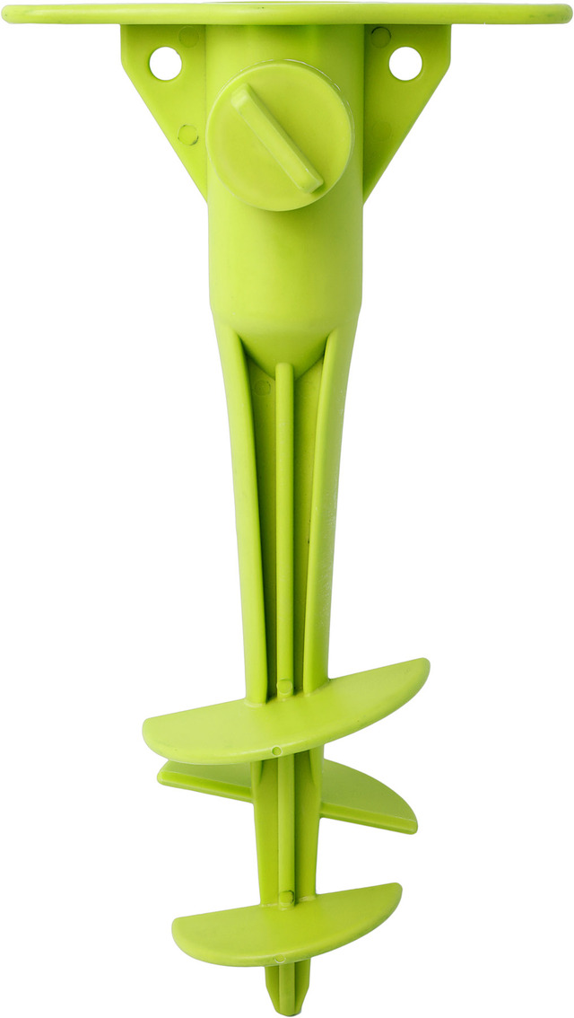 Einschraubbarer Sonnenschirmständer für sandige Böden. Mit Griff und Fixierschraube für den Sonnenschirm. Aus stabilem Kunststoff gefertigt.