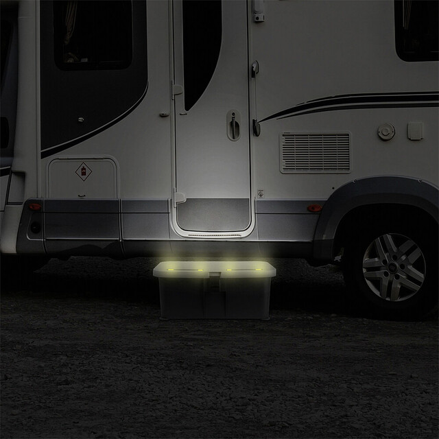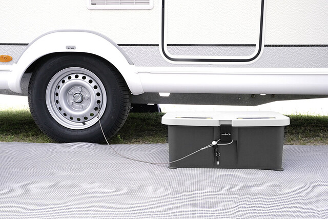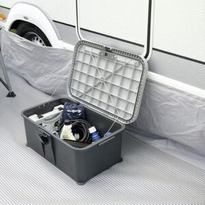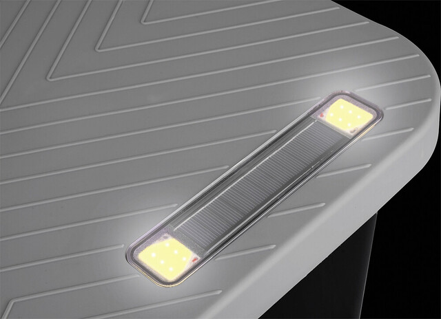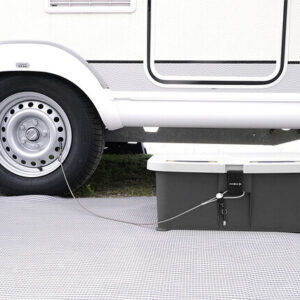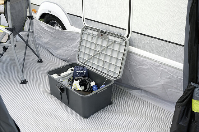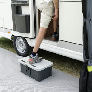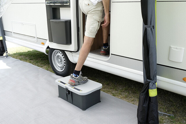 Neu entwickelte Eintrittstufe mit wasserdichtem Innenraum für nützliches Camper-Zubehör wie Werkzeug, Sanitärflüssigkeit, Adapterkabel, und vieles mehr. Der verschließbare Deckel verfügt über eine rutschfeste Trittfläche und ist zudem mit einem integrierten, solarbetriebenen Sicherheits- und Orientierungslicht ausgestattet. Die hochwertige, sehr stabile Kunststoffkonstruktion verfügt zudem über Drehfüsse zur Niveauregulierung auf unebenem Gelände.