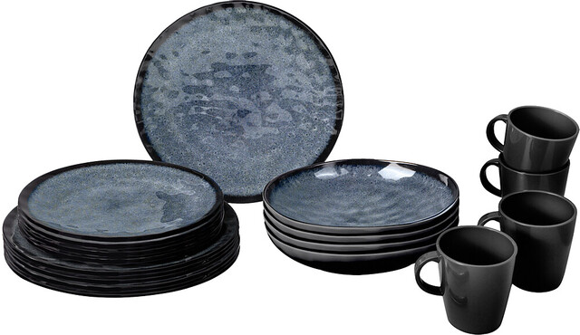 BRUNNER Geschirrset Venetian 16-tlg. Farbe schwarz / blau je 4 x Ess-, Suppen-, Dessert- teller, Henkelbecher