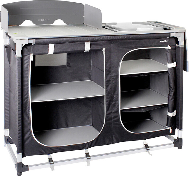 Praktische Küchenbox mit integrierter, herausnehmbarer Faltspüle und 2 großen Staufächern mit viel Platz für Lebensmittel und Kochutensilien.