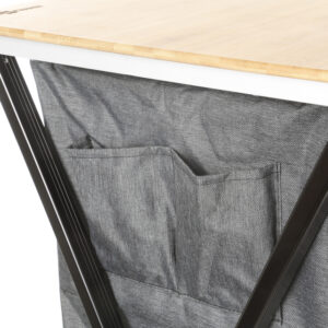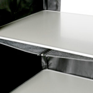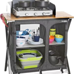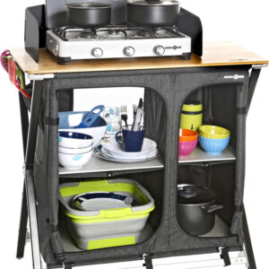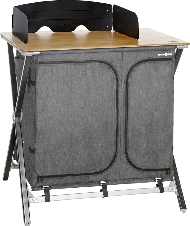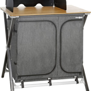 Praktische Küchenbox mit CROSS Rahmen aus Alu-Rechteckprofil und zentralem Metallgelenk. Alle Füße sind höhenverstellbar. Mit zwei Innenablagen und einer obenliegenden Arbeitsplatte aus Bambus. Mountless-System. Inkl. Windschutz und Tragetasche.