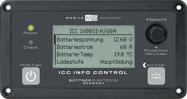 Digitales Bedienteil für ICC 1600 + ICC 3000 im Innenraum. Einfache Überwachung der Geräte mit Einstellmöglichkeit der Eingangsstrombegrenzung.