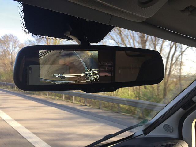 Der Monitor schaltet automatisch beim Einlegen des Rückwärtsgangs ein, während der Fahrt ist er bequem über den Schalter unterhalb der Spiegelfläche einschaltbar. Die Helligkeit regelt sich automatisch und ist zusätzlich einstellbar.
