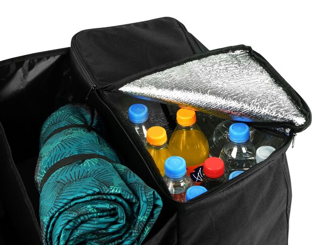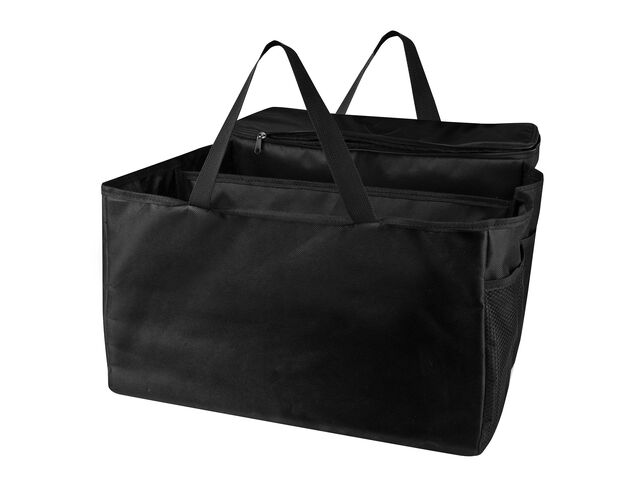 Die Kofferraumtasche dient zum sicheren Transport von Einkäufen, Gepäck, Kinderspielzeug, Werkzeug oder dem Warndreieck. Der faltbare Organizer mit zwei praktischen Tragegriffen an den Seiten passt in jeden Kofferraum und bietet bei Nichtgebrauch ein platzsparendes Verstauen. Die Tasche hat drei große Fächer, ein Netzfach inkl. einem Klettband zur einfachen Befestigung. Besonders geeignet ist der Organizer für Einkäufe aus dem Kühlregal oder für ein Picknick.