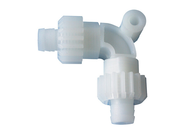 Eine innovative Form der Verschraubung für PE- und PVC-Schläuche. Durch eine strömungsgerechte Kanalführung erhöht sich die Menge des durchgeleiteten Fluids, bei gleichem Druck, um bis zu einem Viertel. Die Verbindung hält einem Druck bis max. 4 bar und einer Temperatur von -15 °C bis 80 °C stand. Innendurchmesser: 10 mm. Verschraubbare PVC-Schläuche (gewebeverstärkt) und PE-Rohr.