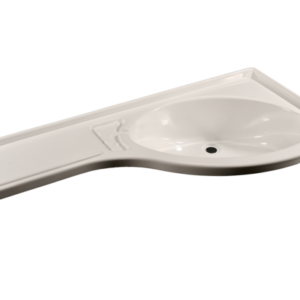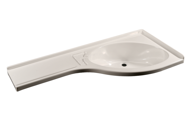 Eckwaschbecken mit Ablage rechts, hergestellt aus hochschlagfestem, matt glänzenden und formaldehydfreiem Polystyrol welches mit einer Schutzfolie kaschiert ist um Kratzer vor dem Einbau zu vermeiden. Ablaufgarnitur optional erhältlich.