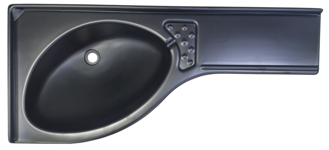 Eckwaschbecken mit Ablage rechts, hergestellt aus hochschlagfestem, matt glänzenden und formaldehydfreiem Polystyrol welches mit einer Schutzfolie kaschiert ist um Kratzer vor dem Einbau zu vermeiden. Ablaufgarnitur optional erhältlich.