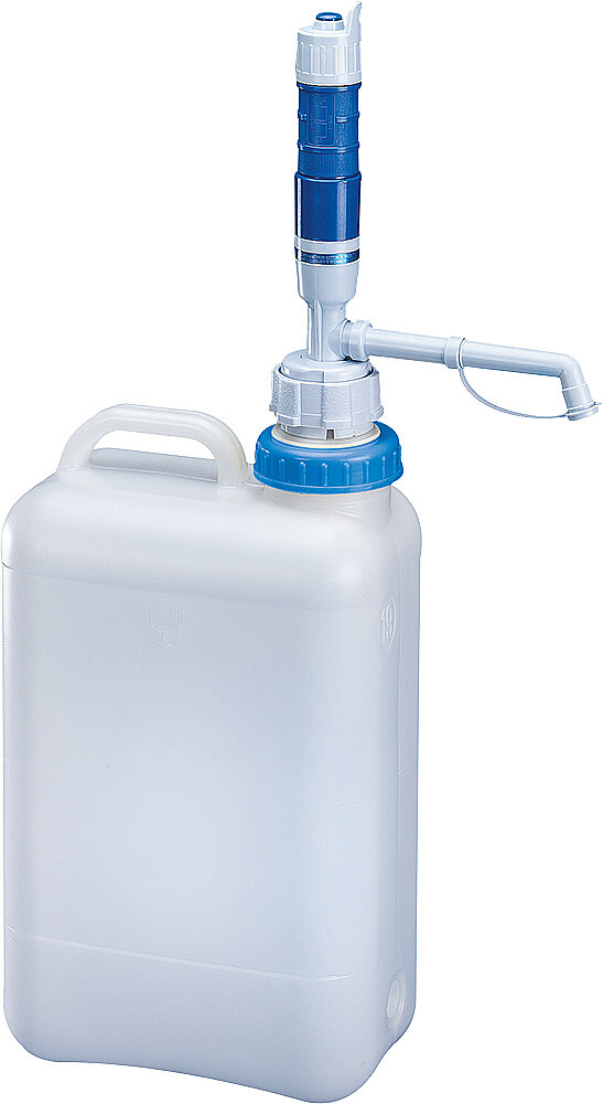 Weithalskanister für 2 Mono-Batterien 1,5 V mit batteriebetriebenem Wasserhahn und mit Pumpenstab der bis auf den Kanisterboden reicht. Das Wasser läuft auf Knopfdruck.