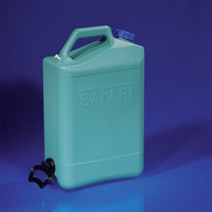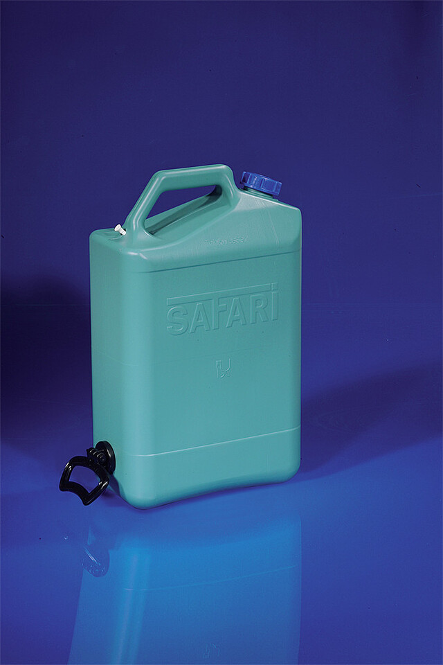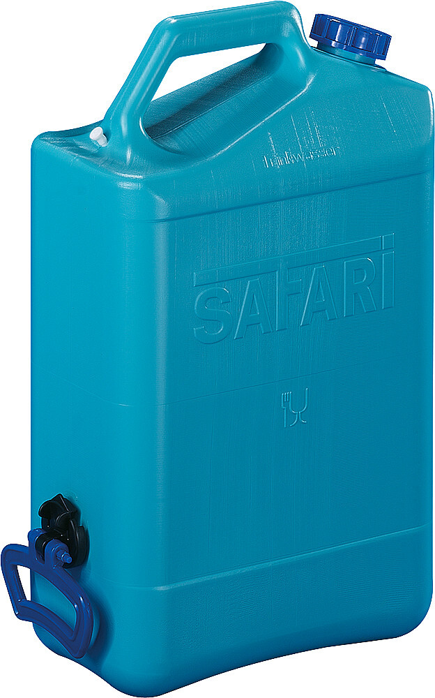 Trinkwasserkanister Safari aus robusten PE für starke Beanspruchung im Camping-, Outdoor- und Trekkingbereich. Mit drehbarem Rangiergriff und Ausgießerverschluss DIN 51. Der Ausgießer kann von beiden Seiten in den Verschluss gedreht werden.