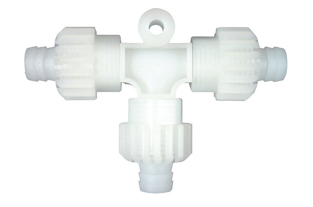 Eine innovative Form der Verschraubung für PE- und PVC-Schläuche. Durch eine strömungsgerechte Kanalführung erhöht sich die Menge des durchgeleiteten Fluids, bei gleichem Druck, um bis zu einem Viertel. Die Verbindung hält einem Druck bis max. 4 bar und einer Temperatur von -15 °C bis 80 °C stand. Innendurchmesser: 10 mm. Verschraubbare PVC-Schläuche (gewebeverstärkt) und PE-Rohr.