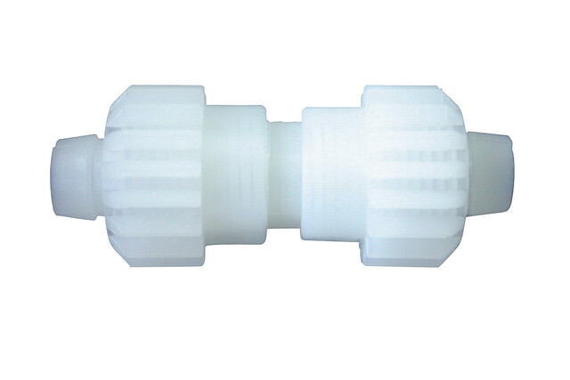 Eine innovative Form der Verschraubung für PE- und PVC-Schläuche. Durch eine strömungsgerechte Kanalführung erhöht sich die Menge des durchgeleiteten Fluids, bei gleichem Druck, um bis zu einem Viertel. Die Verbindung hält einem Druck bis max. 4 bar und einer Temperatur von -15 °C bis 80 °C stand. Innendurchmesser: 10 mm. Verschraubbare PVC-Schläuche (gewebeverstärkt) und PE-Rohr.