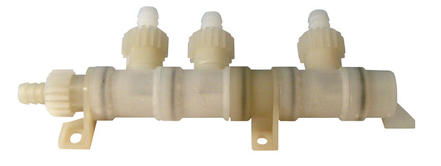 Eine innovative Form der Verschraubung für PE- und PVC-Schläuche. Durch eine strömungsgerechte Kanalführung erhöht sich die Menge des durchgeleiteten Fluids, bei gleichem Druck, um bis zu einem Viertel. Die Verbindung hält einem Druck bis max. 4 bar und einer Temperatur von -15 °C bis 80 °C stand. Innendurchmesser: 10 mm. Verschraubbare PVC-Schläuche (gewebeverstärkt) und PE-Rohr.