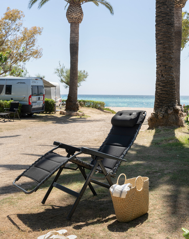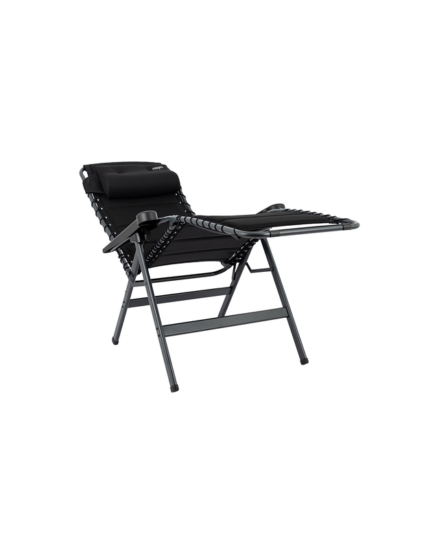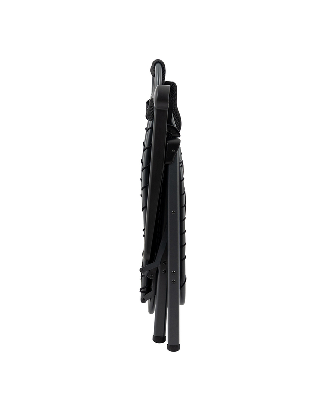 Ein sehr luxuriöser und bequemer Relaxstuhl mit Kopfkissen. Dieser Stuhl bietet maximalen Komfort, da er stufenlos verstellbar und mit einem durch einen Gummizug befestigten gepolsterten 3D-Stoff versehen ist. Die komfortable Polsterung des Stoffs ist besonders luftdurchlässig. Die Verarbeitung verleiht ihm eine stilvolle Ausstrahlung. Sowohl die Rückenlehne als auch die Armlehnen sind ergonomisch geformt und der Stuhl ist mit einem Fixiersystem versehen, mit dem er in jeder gewünschten Position arretiert werden kann. Der Stuhl ist mit einem eloxierten H-Rahmen ausgestattet, der extra Stabilität und Sicherheit gewährleistet. Der Stuhl ist extra breit, extra tief und hat einen besonders hohen Sitz (50 cm). Der Stuhl ist im eingeklappten Zustand sehr kompakt und dadurch einfach zu transportieren in der mitgelieferten Aufbewahrungstasche.
