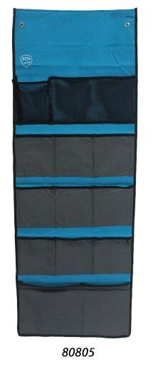 Organizer mit 14 geräumige Taschen, Zeltschienen-Schnur zum einfachen Aufhängen, 2 Aufhängeösen und Klettband zur Rahmenbefestigung.