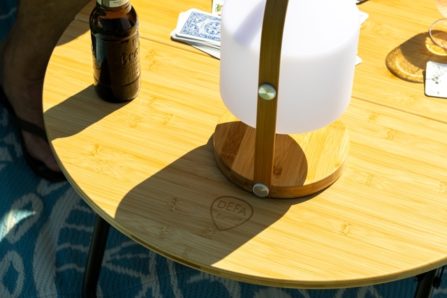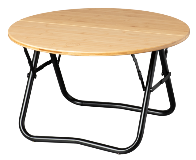 Praktischer runder Tisch für Ihre Kaffeepause unterwegs oder spätabends auf dem Campingplatz. Einfach aufzubauen. Massive Bambusplatte und schwarzes Gestell.