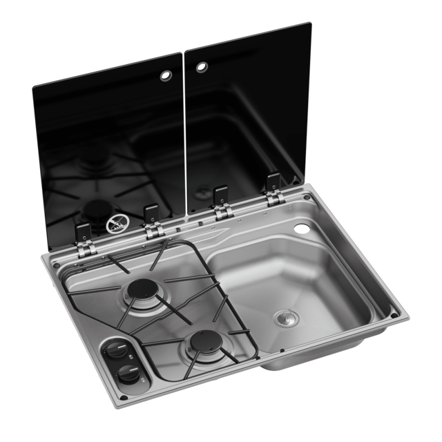 Die Dometic CVC1600G ist eine kompakte Gaskochmulde mit zwei Kochstellen und rechtsseitigem Spülbecken, die eine komfortable Küchenausstattung in Reisemobilküchen ermöglicht. Dank der ergonomisch angeordneten Bedienknöpfe haben Sie alle Kochvorgänge perfekt im Griff. Wenn keine Töpfe auf dem Kochfeld stehen, können Sie die Glasabdeckung schließen, um zusätzliche Arbeitsfläche zu gewinnen – und gleichzeitig Ihr Kochfeld zu schützen. Die Kochfeld-Spüle-Kombination wird flächenbündig in die Arbeitsplatte eingebaut. Siphons und Wasserhähne sind separat erhältlich (Sie können z. B. den Dometic Wasserhahn AC539 und den Siphon AC530 verwenden). Das passende Hahnloch ist bereits vorgebohrt.