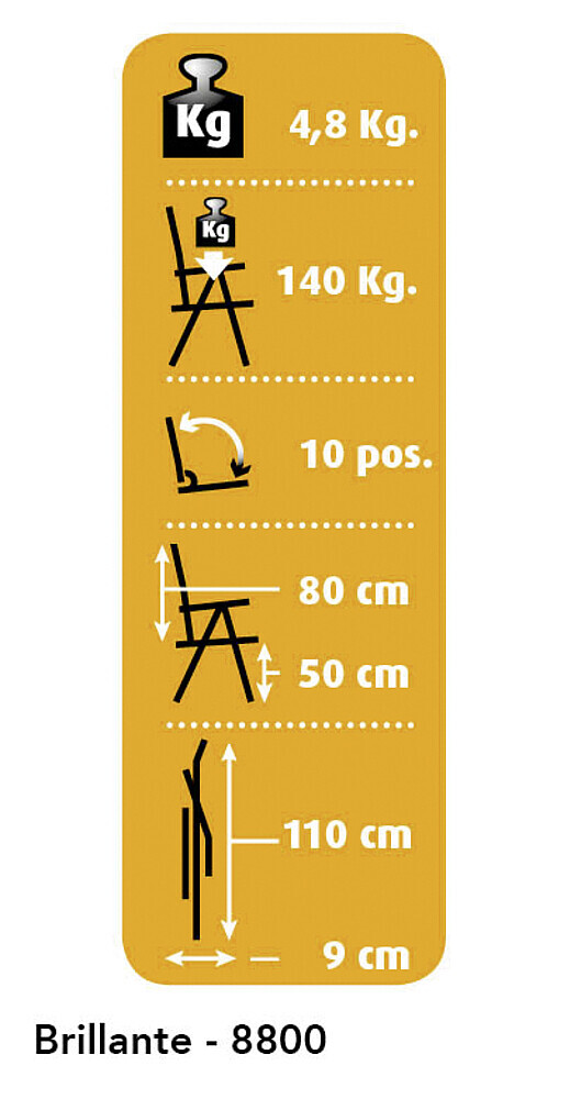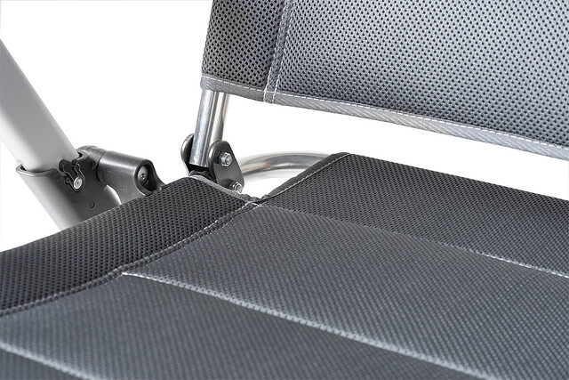 Gestell aus Aluminium, innen verstärktes anodisiertes Ovalrohr. Die Armlehnen extra breit und aus glasfaserverstärktem Nylon.