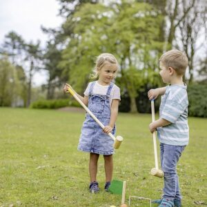 eim Eichhorn Krocket Spiel müssen bunte Holzkugeln mit hammerähnlichen Schlägern aus Holz durch kleine Tore in einer vorgegebenen Reihenfolge und Richtung bis zum Ziel gebracht werden. Das Set beinhaltet zwei 65 cm große Schläger, 4 Bälle mit einem Durchmesser von 50 mm, ein Start- und ein Ziel-Stab sowie 10 Tore zum Aufstellen. Zu Ostern, zum Geburtstag oder einfach so ist das Krocket Set die perfekte Geschenkidee und sorgt für großen Spielspaß in jedem Garten und Park. Das Spiel ist super leicht und schnell auf der Wiese aufgebaut und spielbereit, und ist für Kinder ab drei Jahren geeignet.