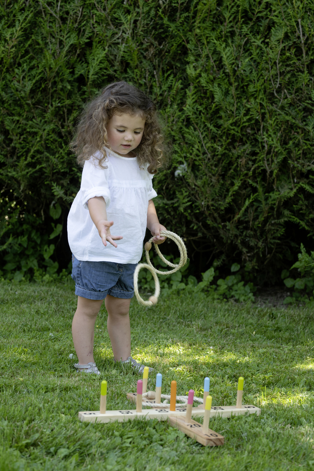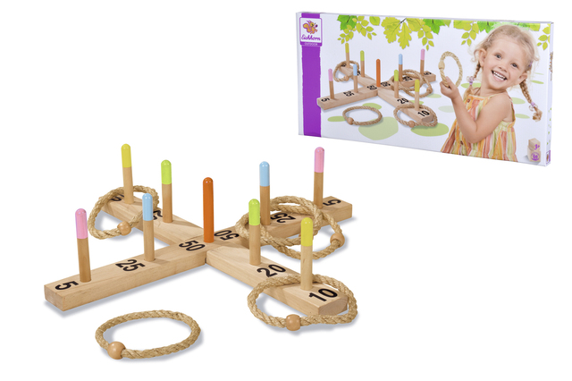 Eichhorn Outdoor Ringwurfspiel: Das Eichhorn Ringwurfspiel aus hochwertigem Holz ist ein cooles Geschicklichkeitsspiel für den Garten. Das Kreuz mit den 9 Pins wird auf den Boden gelegt. Aus einer festgelegten Entfernung müssen die Ringe über die Pins geworfen werden. Jeder Pin bringt unterschiedlich viele Punkte. Wer am meisten Punkte erzielt, hat gewonnen. Für Kinder ab 3 Jahren geeignet.