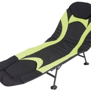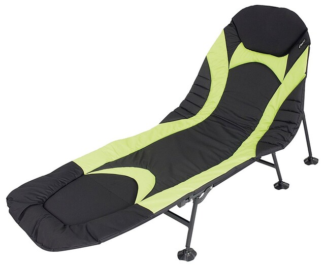 Bequemes Campingbett aus klappbarem Stahlrahmen mit weich gepolstertem PolyesterOberteil. Verstellbarer Rückenlehne mit verstellbarer Stütze.
