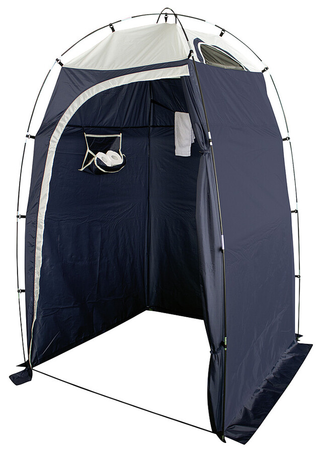 Geräumiges Toiletten-oder Duschzelt. Große Eingangstür. 2 abschließbare Netzfenster. 2 Utensilientaschen für Toilettenartikel und ein Nylonband zum Aufhängen des Toilettenhandtuchs.