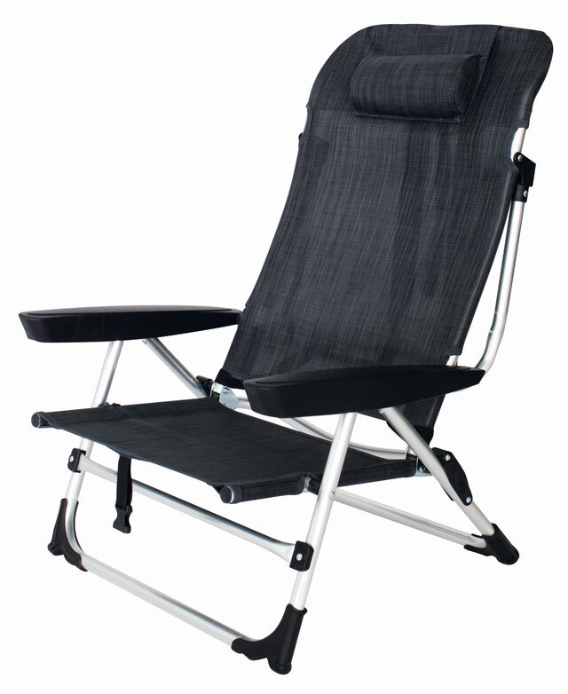 5-fach verstellbarer Strandstuhl mit Liegeposition und mit Schultergurt.