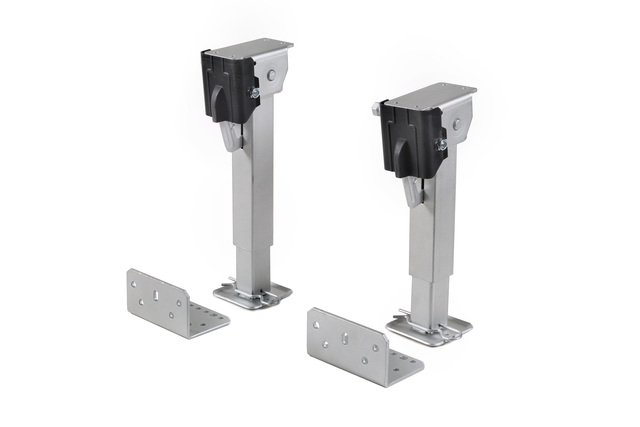 Die Kurbelstütze zeichnet sich durch einfache Handhabung und eine ausgezeichnete Qualität aus. Dank des Stecksystems kann der Abstand zum Boden schnell und effektiv angepasst werden. Es sind außerdem Stützen für die Hinterachse mit Universal-Befestigungswinkel vorhanden.