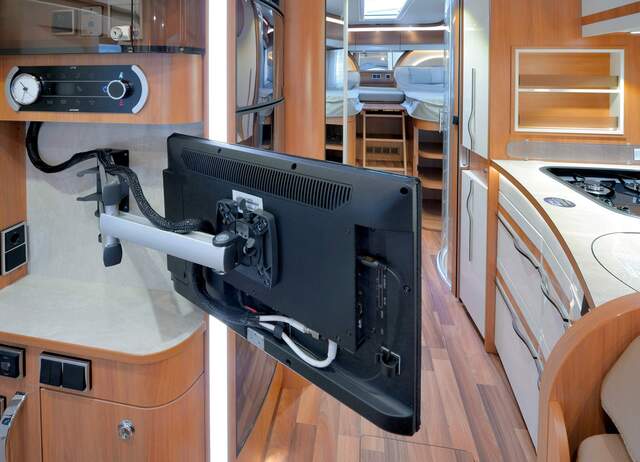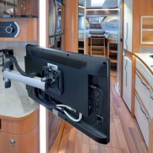 Doppelgelenk mit Arretierung in 0-Position zur Sicherung des Bildschirms, sowie Monitor-Schnellverschlussplatte zum schnellen und einfachen Entfernen des Bildschirms.