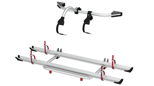 Fahrradträger mit Auflagebügel zur Befestigung am Boden und Bike-Block-Halterungen an der Wand oder Decke. Passend für Heckgaragen eines Reisemobils. Geeignet für max. 3 Fahrräder