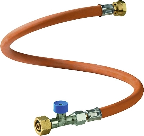 Hochdruck-Schlauchleitung mit Schlauchbruchsicherung zum Anschluss an alle wandmontierten Niederdruckregler mit Eingang AG M20 x 1,5 insbesondere für das Heizen während der Fahrt an das Gasflaschenventil.