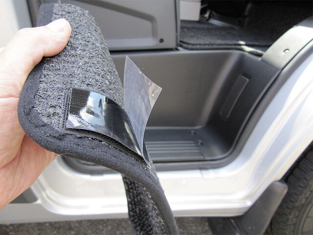 Nadelfilz mit Einrippenstruktur passgenau geformt für den sauberen Einstieg ins Fahrerhaus. Anbringung mit Klettband, fertig vorgeklebt auf der Matte. Hält Schmutz und Wasser draußen.