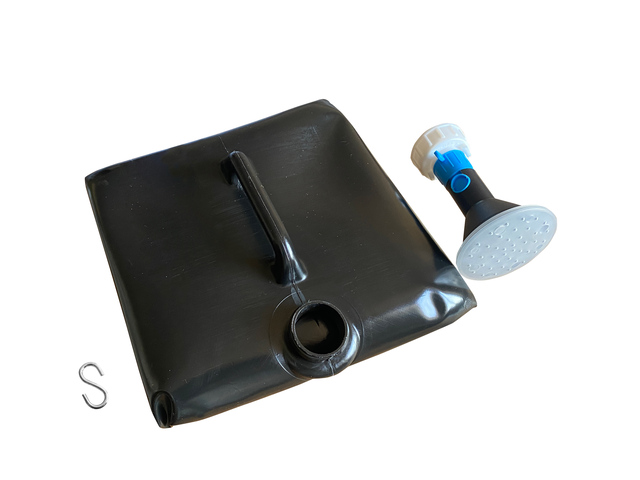 Warmduschen / Waschen durch Sonnenenergie. Ideal beim Camping, zu Hause, Garten etc. Extra großer Brausekopf. Mit Absperrhahn und S-Haken zum aufhängen.