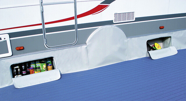Ein Doppelreißverschluß ermöglicht bequemen Zugang. In jeder Tasche ist ein Insektenschutzgewebe eingeschweißt, um Kondenswasserbildung zu vermeiden. Schürze und Standard-Radkastenabdeckung (150 cm lang) beliebig mit einer stabilen Schere kürzbar.