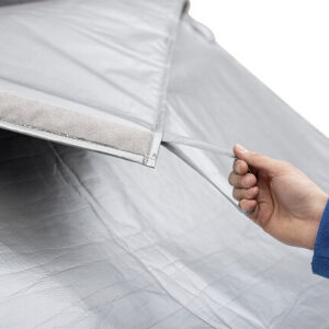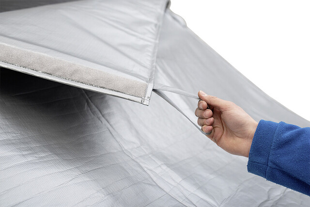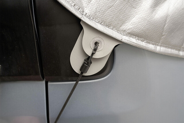 Wie bei HINDERMANN Außenisoliermatten üblich, lässt sich auch bei der CLASSIC-Version die Frontklappe öffnen. Wir empfehlen, beim Anbringen der Matte die Fahrerhaustüren leicht geöffnet zu halten um die verstellbaren Türtaschen aufzulegen. So hat die isoliermatte sicheren Halt und sitzt perfekt.