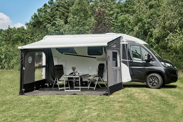 Kompletteinheit mit linker und rechter Seitenwand. Diese Seitenwände können einzeln, z.B. nur als Windschutz, oder mit einer Buddy Front zu einem kompletten Markisenvorzelt kombiniert werden. In jeder Seitenwand befindet sich eine Tür, ein Fenster oben und eine Lüftungsgaze mit Folienabdeckung unten. Zusätzlich kann eine große Hochentlüftung per Reißverschluss geöffnet werden. Dies ermöglicht eine optimale Luftzirkulation. Beide Seitenteile lassen sich, dank Reißverschluss, an heißen Tagen schnell herausnehmen oder zu einer Verandalösung abklappen. Der Aufbau ist denkbar einfach! Für die Seitenteile werden 2 leichte CarbonX-Stangen mit Spannfeder zwischen Markisenkasten und Markisenblende gespannt. Die Verbindung zwischen Seitenteil und Markisentuch (Dach) wird dann mit kräftigen Magneten (pro Stck. ca. 30 kg belastbar) hergestellt. Am Fahrzeug wird ein breiter PVC Stoffstreifen gespannt, so dass Sie bei jeder Fahrzeugform einen möglichst dichten Abschluss bekommen. Für eine optimale Belüftung verfügen die beiden Seitenteile des Buddy über eine integrierte Belüftung oben sowie Moskitonetze.