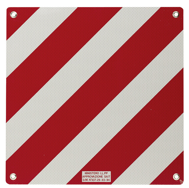 Reflektierendes Aluminium Schild in der Farbe rot/weiss für überhängende Lasten, mit 4 Löcher und Ösen. abgerundete Ecken Durchm. 2 cm.