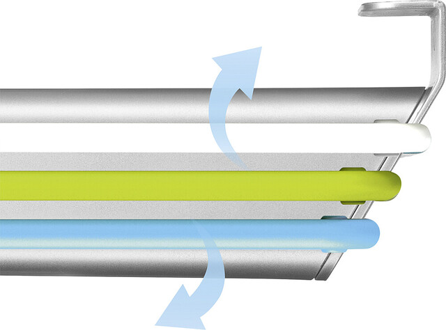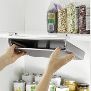 Dieses innovative Schneidebrett-Set nutzt den ungenutzten Raum unterhalb eines Regalbretts optimal aus und maximiert damit jeden Zentimeter Ihrer Schrankfläche. Zum Set gehörten drei farbkodierte Schneidebretter hat beidseitig messerfreundlich strukturierten Schneideflächen, Edelstahlgriffen und rutschfesten Füßen. Sie sind in einem schlanken Aufbewahrungsbehälter untergebracht, der an einem vorhandenen Regal eingehängt und an der Rückseite mit zwei kleinen Schrauben (inklusive) gesichert wird. Der Aufbewahrungsbehälter kann entweder im Schrank oder darunter angebracht werden. Sein gestuftes Design erleichtert den Zugriff auf das gewünschte Schneidebrett.