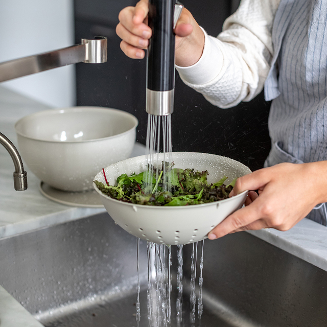 Die kleine Seihe zum Abtropfen von Nudeln, Gemüse und Früchten begeistert durch ihr klares Design und die perfekte Funktionalität. Die sternförmige Lochung ermöglicht rasches Abtropfen und ist gleichzeitig dekoratives Gestaltungselement. Ihre Innenseite ist hochglänzend poliert, so gleiten die Lebensmittel ganz leicht in Servierschale oder Topf und sie lässt sich zudem sehr leicht reinigen. Die kompakte Seihe passt perfekt in Schüssel PALSBY M und kann damit platzsparend im Schrank verstaut werden.