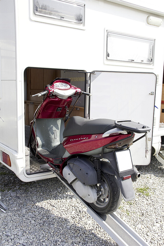 Vorderradaufnahme zum Einfahren eines Rollers mittels 12 V Motor, separate Rampe und Fernbedienung.