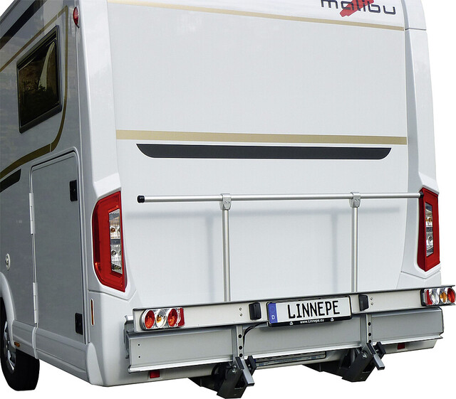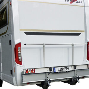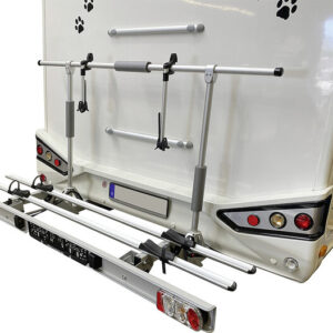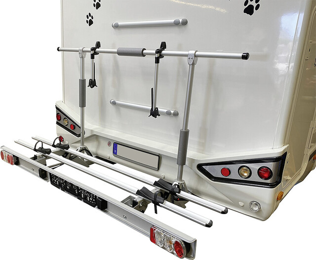 Die Variante des klappbaren Trägers für Reisemobile ist mit einem Schienensystem und Haltearmen für den Transport von bis zu zwei E-Bikes geeignet. Nachträglich lässt sich der Träger problemlos umrüsten für den Transport von einem Roller