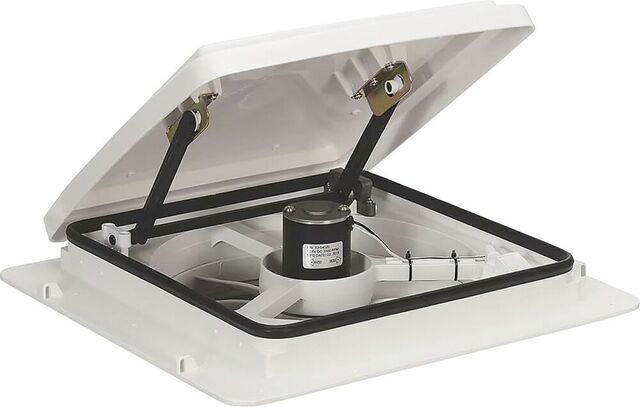Dachhaube mit leistungsstarkem 10-stufigem Ansaug- und Abluftventilator. Auch bei geschlossenem Deckel zirkuliert die Luft im Wohnmobil.