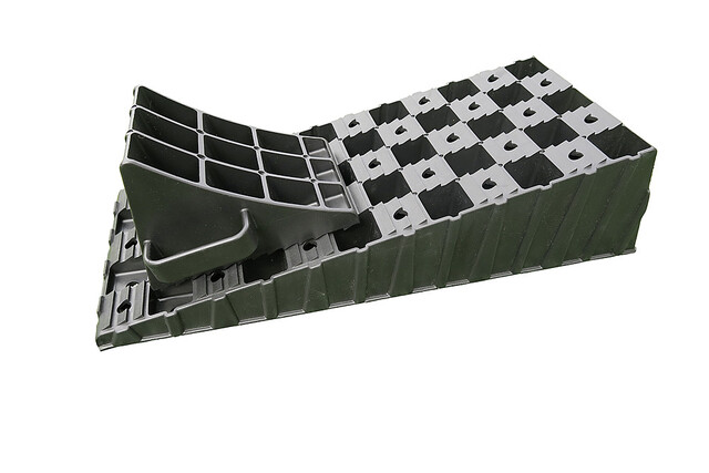 Auffahrkeil für Wohnwagen und Reisemobil mit großer Grundfläche um Einsinken in weichem Boden vorzubeugen. Die patentierten Auffahrfläche bewirkt, dass der Keil nicht wegrutscht wenn keine Gripmatte verwendet wird. Mit Hilfe des Unterlegkeils kann das Fahrzeug optimal gesichert werden und die Auflagefläche des Keils erweitert werden.