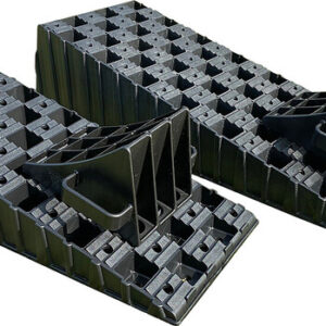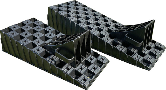 Stufenloser extra großer Auffahrkeil mit patentierter Auffahrfläche. Die Keile sind leichtgewichtig, rutschfest und haben eine feste Bodenhaftung. Traglast 1.000 kg pro Reifen